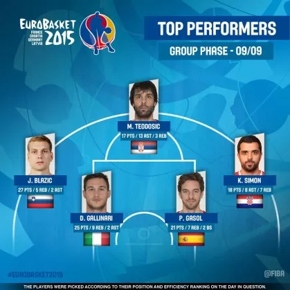 Danilo Gallinari (Italija) – 39 minut, 25 točk (3/5 za dve, 2/6 za tri, 13/15 PM), 9 skokov, 2 podaji, 1 pridobljena in 1 izgubljena žoga.