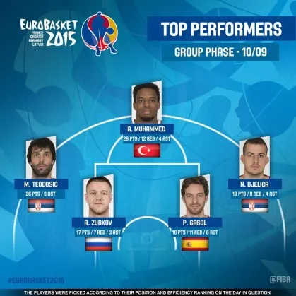 V najboljši peterki zadnjega dne prvega dela prvenstva tokrat znova najdemo Srba Miloša Teodosića in Španca Paua Gasola, družbo pa jima delajo igralec turške reprezentanca, Ali Muhammed, še en Srb, Nemanja Bjelica, in Rus, Andrey Zubkov.