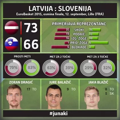Slovenska reprezentanca je zaključila z nastopi na letošnjem EuroBasketu. Varovanci Jureta Zdovca so na tekmi osmine finala klonili proti Latviji, s 66:73. Naš najboljši strelec je bil s 17 točkami Zoran Dragić, kapetan Jure Balažić pa jih je dodal devet. Naša izbrana vrsta s porazom ostaja brez možnosti za udeležbo v kvalifikacijah za olimpijske igre v Riu.