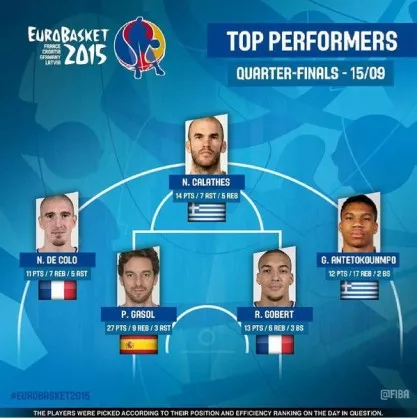 Oba branilca, ki jih najdemo v najboljši peterki prvega dne četrtfinalnih obračunov, sta igrala vsestransko – Grk Nick Calathes je 14 točkam dodal sedem podaj in pet skokov, Francoz Nando De Colo pa 11 točkam, sedem skokov in pet podaj. Najboljši strelec torkovih obračunov je bil seveda Pau Gasol s 27 točkami, v statistiko pa je dodal še devet skokov in dve blokadi. Francoz Rudy Gobert je k zmagi Francije nad Latvijo prispeval 13 točk, šest skokov in tri blokade.