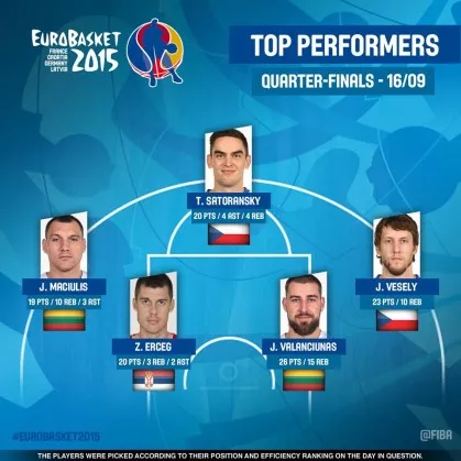 Vesely in Tomas Satoransky sta proti Srbiji skupaj dosegla kar 43 točk, kar je več kot polovica vseh točk češke reprezentance. Prav onadva sta bila tista, ki sta držala češko barko pokonci, toda na koncu je prevlada moč Srbije. Pri srbski reprezentanci pa je blestel Zoran Erceg, ki je na tekmi zgrešil le en met za tri točke, na koncu pa se je ustavil pri okroglih 20 točkah. Jonas Maciulis je proti Italiji na parketu prebil kar 41 od možnih 45 minut in v statistiko vpisal dvojni dvojček.