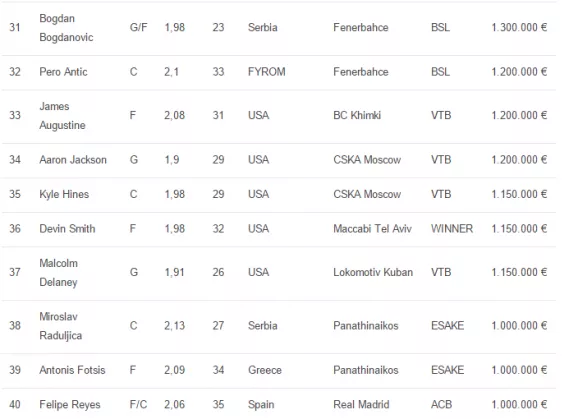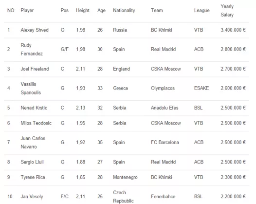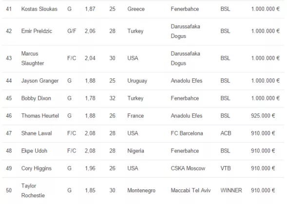 - Istanbulski Fenerbahce in moskovski CSKA imata med 50 največjimi zaslužkarji oba po 8 košarkarjev, kar je hkrati tudi največ med vsemi klubi