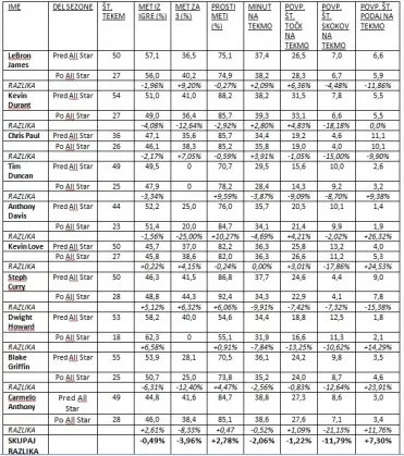 Za to analizo vzemimo skupino desetih najboljših NBA igralcev po izboru priznanih novinarjev v ZDA. Da bi se igralec kvalificiral na seznam, je moral igrati 70% vseh tekem svoje franšize pred in po premoru za All Star tekmo. Prejšnjo sezono se trije top 10 NBA igralci niso uvrstili na ta seznam: Kawhi Leonard, Blake Griffin in Kevin Durant.