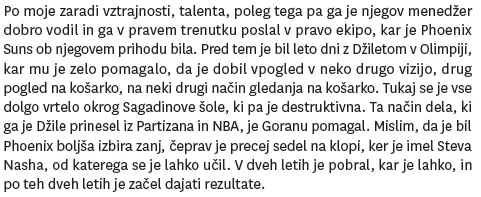 Tokrat vam predstavljamo izseka iz osmega poglavja z naslovom “Za Slovenijo“. V osmem poglavju lahko preberemo intervju s selektorjem slovenske reprezentance ne EP v Litvi 2011 in na EP v Sloveniji 2013 Božo Maljkovićem in s sedanjim selektorjem Juretom Zdovcem, ter dvema nekdanjima kapetanoma reprezentance, Rošom Nesterovićem in Jako Lakovićem. Rašo je med drugim povedal tudi svoje mnenje, zakaj misli, da je Gogiju uspelo to kar mu je: