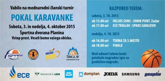 Danes (sobota, 3.10.) in jutri (nedelja, 4.10) se bo v organizaciji KK Triglav Kranj, v kranjski športni dvorani Planina odvil tradicionalni članski turnir za Pokal Karavanke. Za pokal se bosta udarili domači moštvi ECE Triglav in Heliso Suns, da pa bo pokal mednarodno obarvan, pa bosta poskrbela moštvi Sonik Puntamika iz Zadra in sarajevski Spars.
