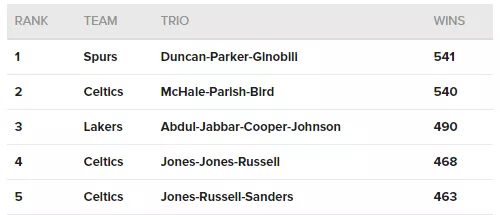 Košarkarji San Antonio Spursov so danes ponoči s 95:87 premagali moštvo Boston Celtics in tako prišli do druge zmage v letošnji sezoni. Ta pa je imela poseben pomen za prve tri zvezdnike moštva iz Teksasa. Tony Parker, Tim Duncan in Emanuel Ginobili so s to zmago posatli trojka z največ zmagami v rednem delu lige NBA. Ko so na tekmi zaigrali vsi skupaj so namreč dobil kar 541 tekem in tako za eno zmago prehiteli dosedanje rekorderje Kevina McHalea, Larrya Birda in Roberta Parrisha, ki so prav v dresu Bostona skupaj nanizali 540 zmag.