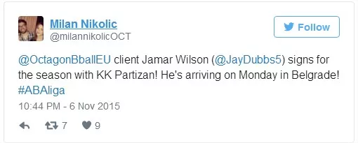 Po poročanju njegovega menedžerja Milana Nikolića, naj bi Jamar Wilson (185cm, 1984) z beograjskim klubom sklenil pogodbo, po kateri naj bi za črno-bele igral do konca letošnje sezone, v Beograd pa naj bi prispel v ponedeljek.