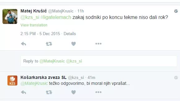 Košarkar Zlatoroga Matej Krušič pa se je na Twitterju obrnil na pojasnilo kar na KZS. Zanimalo ga je, zakaj sodniki niso dali rok po koncu tekme. Na KZS so mu prijazno pojasnili, da bo moral za to povprašati kar sodnike (osebno).
