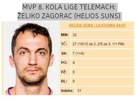 V sredo se je z zaostalo tekmo zaključilo 8. kolo Lige Telemach. V njem se je najbolj izkazal košarkar Helios Sunse Željko Zagorac, ki je svojo ekipo na prvem derbiju dveh domžalskih prvoligašem popeljal do prepričljive zmage.