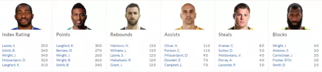 Po številu točk je tokrat izstopal Unicsev Keith Langford, ki je Maccabiju natresel 30 točk. Ko je govora o najboljših skaklcih, sta si ta naziv tokrat s po 13 skoki razdelila Nikola Marković (PAOK) in Latavious Williams (Unics). Tudi pri asistirnaju sta bila izenačena dva košarkarja in sicer sta po 11 asistenc soigralcem podelila Courtney Forson (Banvit) in Albert Oliver (Gran Canaria). V obrambnih akcijah pa sta bila najbolj razpoložena Oldenburogv Christoper Kramer, ki je ukradel 8 žog in Trentov Julian Wright, ki je nasprotnikom podelil 4 blokade. Pri Olimpijinih košarkarjih je bil še najbližje najboljšim Saša Zagorac z 10 skoki.