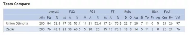 UOL: Wright 5 (6 podaj), Mesiček 4 (3 skoki), Nikolič 10 (3/3 za 3, 3 podaje), Vučetić 4, Lapornik 15 (3 skoki), Lešić 22 (4 skoki, 5 ukr. Žog), Zagorac 11, Mahkovic 6, Zakis 7.