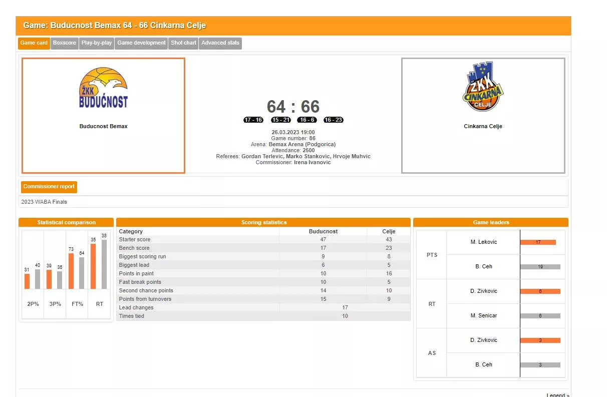 Budućnost Bemax-Cinkarna Celje 64:66 (17:16, 15:21, 16:6, 16:23)