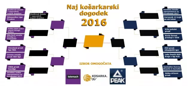 Na portalu Košarka.si smo tudi letos pripravili izbor NAJ košarkarskega dogodka leta 2016, v katerem boste prav vi izbrali dogodek, ki je po vašem mnenju v letu 2016 najbolj zaznamoval košarkarsko sceno doma in po svetu. Izbrali smo 16 najbolj odmevnih košarkarskih dogodkov preteklega leta, z vašo pomočjo pa želimo po sistemu izpadanja dobiti tisti dogodek, ki je po vašem mnenju v preteklem letu najbolj zaznamoval košarkarsko dogajanje doma in po svetu.