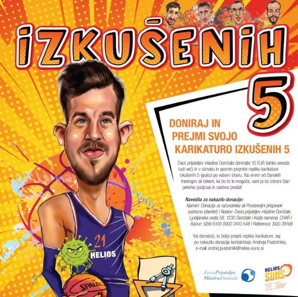 Blaž Mahkovic, Mihailo Sekulović, Tadej Ferme, Daniel Vujasinović in Gezim Morina. To je pet izkušenih Helios Sunsov, ki jih je v karikature spremenila nekdanja vrhunska košarkarica, danes pa odlična karikaturistka, Domžalčanka Nana Guberinič. Težko se ji z besedami dovolj zahvalimo za sodelovanje v dobrodelni akciji, ki bo, v sodelovanju z Zvezo prijateljev mladine Domžale, kar nekaj otrokom iz domžalske občine z nakupom nove računalniške opreme olajšala šolanje na domu, koristi pa bodo seveda imeli tudi pozneje, ko se vrnejo v šolske klopi.