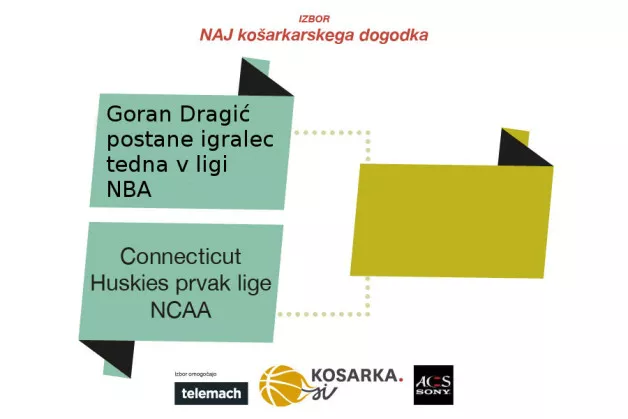 V drugem krogu letošnjega izbora za NAJ košarkarski dogodek, se bosta pomeril Goran Dragić, ki je najbolj navdušil v ligi NBA in študentska ekipa iz Connecticuta, ki je osvojila naslov prvaka lige NCAA. Mi smo vam pripravili kratek opis obeh dogodkov, na vas pa je da preko aplikacije NAJ DOGODEK LETA glasujete za dogodek, ki je po vašem mnenju bolj zaznamoval košarkarsko dogajanje v preteklem letu. Med vsemi sodelujočimi bomo vsak dan izžrebali 5 nagrajencev, ki bodo prejeli praktične nagrade.Goran Dragić postane igralec tedna v ligi NBA