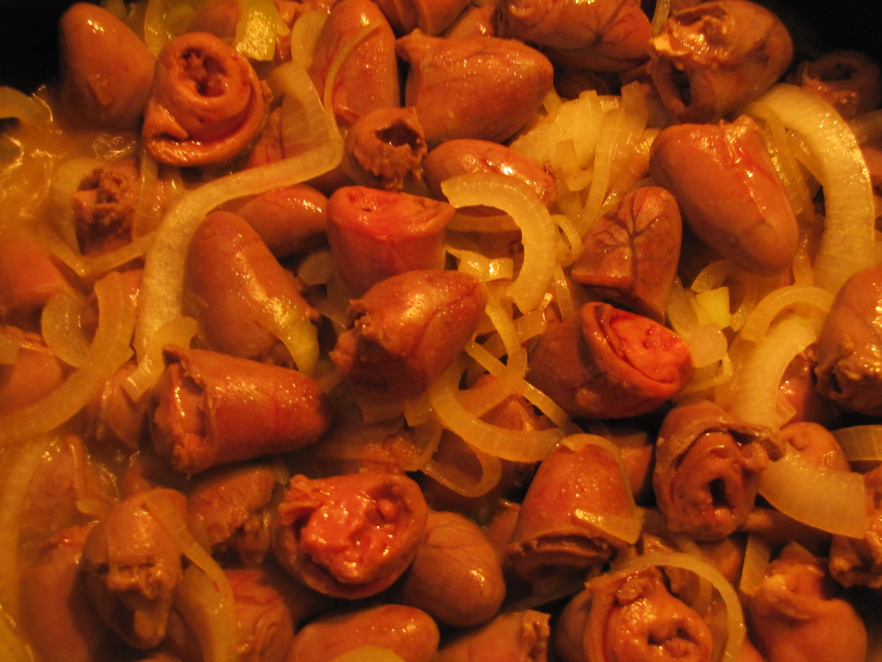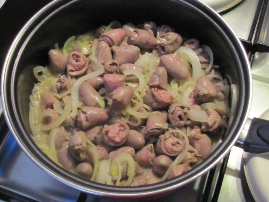 Čebulo in srčeca pražiš na delno do pretežno zmernem ognju, dokler đbula ne postekleni, potem pričneš z občasnimi vlivi vode v kozico.