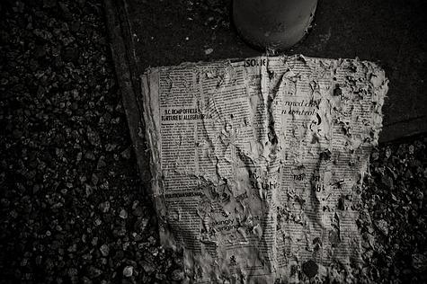 Trgalo ga je na drobne kosce, bil je kot moker star časopis, s katerega polzijo črke, na katerem se verižijo stavki in izgubljajo vsebino, postajajo nesmiselne krace na brezobličnem kosu spranega papirja.