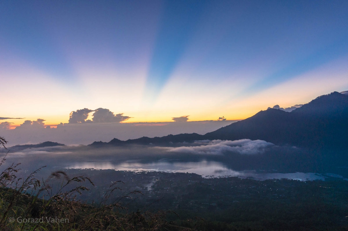 Sončni vzhod z vulkana Batur, pogled na kaldero ognjenika.