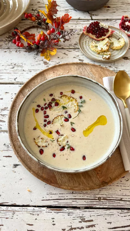 Pečena cvetača nima tistega močnega okusa po "kapusnicah" in zato je juha iz pečene cvetače veliko okusnejša. Moje dete, ki ne mara cvetače, jo je pojedlo cel krožnik. Juho lahko popestrite še z granatnim jabolkom in praženim sezamom. Noro, kako se okusi lepo prepletejo in povežejo.