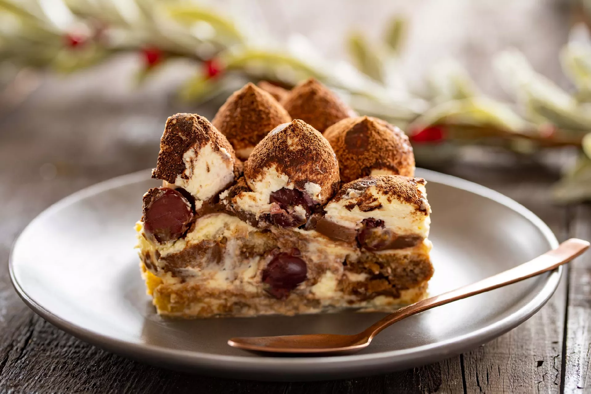 Novoletni tiramisu je bogat in neverjetno okusen. Sestavljajo ga mascarponejeva krema začinjena z jajčnim likerjem, cimetov ganache in višnje. Vsak grižljaj je popolna harmonija okusov, ki se odlično priležejo v prazničnem času.