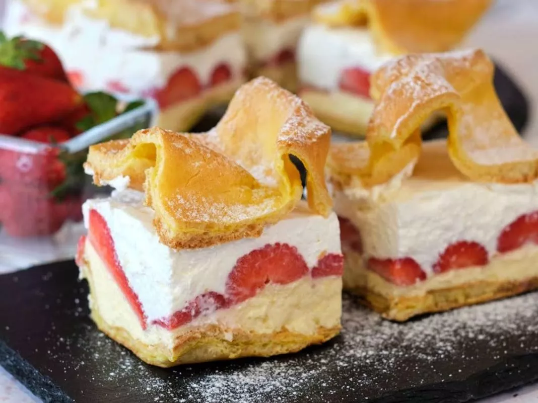 Ta sladica ne očara le s svojim nenavadnim videzom, ki spominja na gorske vrhove – temveč tudi s popolno kombinacijo mehkega, zračnega biskvita, svilnate kreme in svežih jagod lahko tudi kompot.