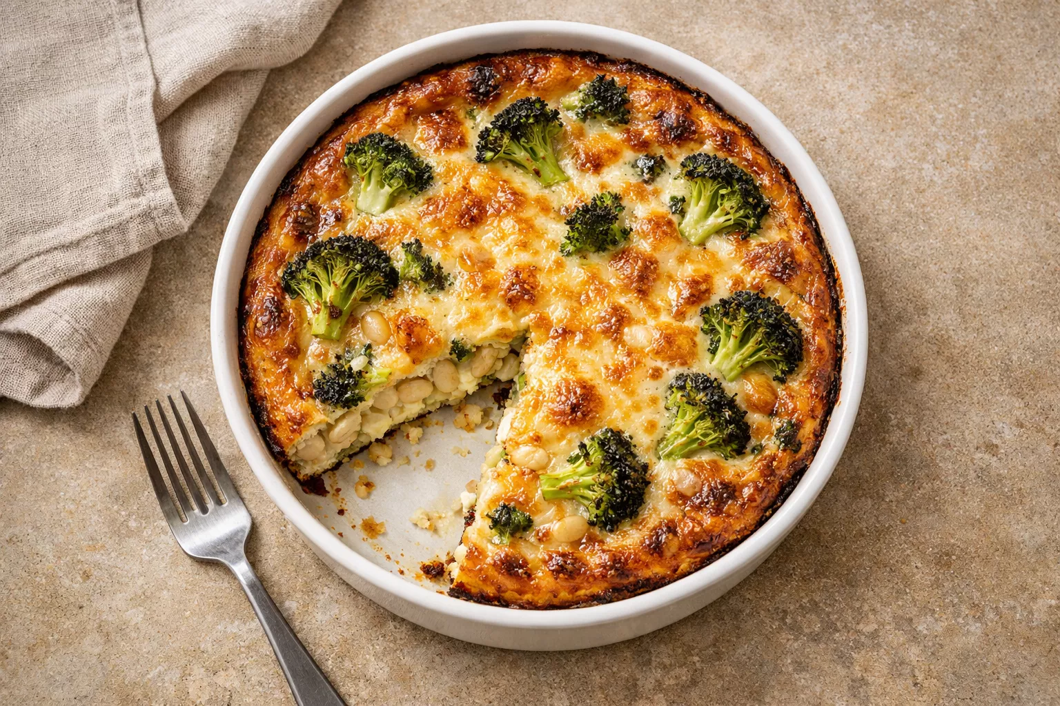 Ta slana pita z brokolijem, belim fižolom in sirom je preprosta za pripravo in primerna za vsak del dneva. Posebnost recepta je, da ne vsebuje testa, a kljub temu ohranja bogat, poln okus. Glavno vlogo imajo nasiten bel fižol, pečen brokoli in aromatičen sir.