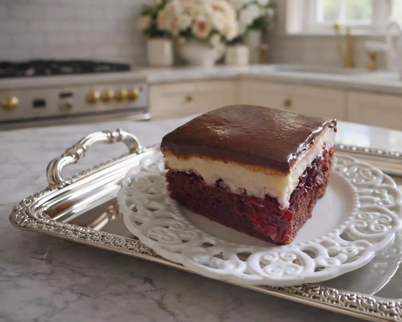 To višnjevo pecivo združuje čokoladni biskvit, sadni preliv in kremasto plast.