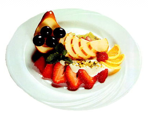 Oprano in očiščeno sadje narežemo. Damo ga v stekleno skledo, dodamo limonin sok in sladkor. Sadje nekoliko časa pustimo, da se marinira, nato ga dekorativno naložimo na krožnik in prelijemo s tofujevo kremo. Tofu krema: Tofu, sojino mleko, med in vanili sladkor zmiksamo s paličnim mešalnikom. Omako dekorativno prelijemo po mariniranem sadju.