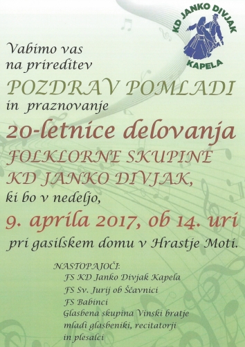POZDRAV POMLADI-20 LET FOLKLORNE SKUPINE KD JANKO DIVJAK KAPELA 9.4.2017 ob 14 uri