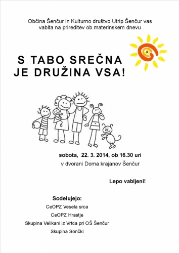 Kulturno društvo Utrip Šenčur - COPZ Vesela srca danes ob 16.30 prireja prireditev ob materinskem dnevu. Lepo vabljeni, ob 16.30 uri v dvorano Doma krajanov v Šenčurju.