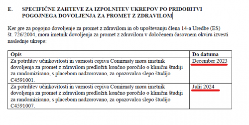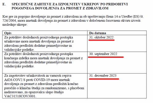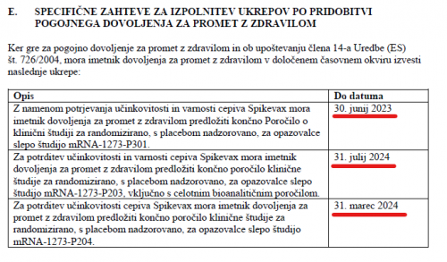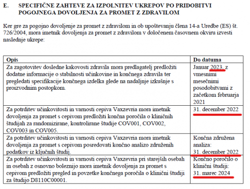 V vsakem od teh dokumentov obstaja nekaj podobnega temu "SPECIFIČNE ZAHTEVE ZA IZPOLNITEV UKREPOV PO PRIDOBITVI POGOJNEGA DOVOLJENJA ZA PROMET Z ZDRAVILOM" in v tem delu se nahaja tabela z roki za določene zadeve: