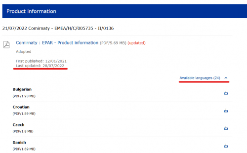 Če se pogleda na spletni strani EMA (European Medicines Agency) lahko ugotovimo, da so, med ostalimi, objavljeni POSODOBLJENI dokumenti glede cepiv proti COVID-19 vseh proizvajalcev, ki so dobili ZAČASNO dovoljenje za uporabo in to v 24 JEZIKIH (povezave so spodaj - za ilustracijo glej sliko).