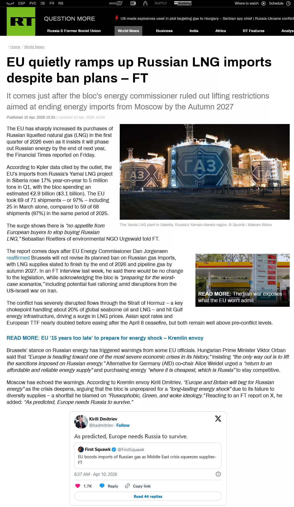 Moskva se je pridružila tem opozorilom. Po besedah kremeljskega odposlanca Kirilla Dmitrjeva bosta »Evropa in Velika Britanija prosili za rusko energijo«, ko se bo kriza poglabljala, pri čemer trdi, da je blok nepripravljen na »dolgotrajni energetski šok«, ker mu ni uspelo diverzificirati oskrbe – pomanjkljivost, za katero je krivil »rusofobno, zeleno in »woke« ideologijo«. V odzivu na poročilo FT o X je dodal: »Kot je bilo napovedano, Evropa potrebuje Rusijo, da preživi.«