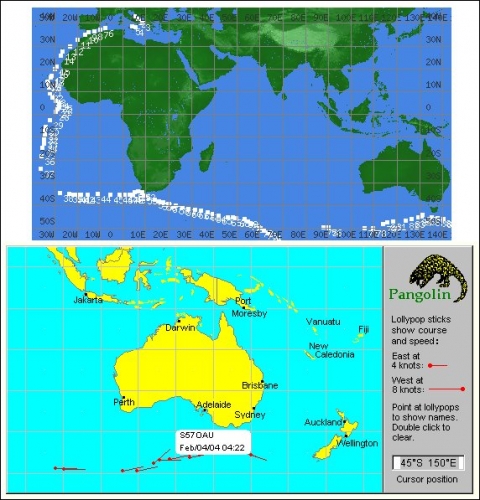 Trenutno sem že v Pacifiku, oz. v Tasmanovem morju. Ha, morje se sliši tako majhno, že dolgo se ne vozim po morju ampak po oceanih. Tu je vse po starem. Uspešno sva se slišala z Borisom, trenutno je moja preokupacija šport, nenehno se gibam. Posledice negibanja so strašne, prsti na nogah kot da so iz drugega sveta, vendar počasi gre na bolje, čeprav ne dosti. Napredujem dokaj počasi, tu vetrovi niso tako močni in če so v krmo, je hitrost še manjša, tako sem danes na 800 nm do Bluffa h., tako, da je pred mano še najmanj 8 dni plovbe. Upam, da bom lahko v Bluffu popravil jadra. Želim pojesti kaj konkretnega, nekaj pečenega, njam, sanjam pa tudi že o mamini potici in pečenih mastnih rebrcah. Za danes naj bo dovolj, da vas ne bodo bolele očke od gledanja v monitor.