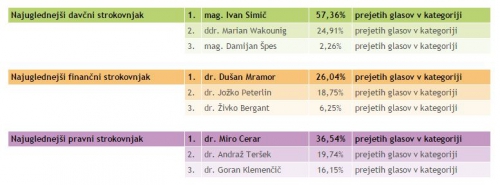 Portal Tax-Fin-Lex je na osnovi svoje mini ankete izbral najuglednejše strokovnjake naše deželice in sicer je za najuglednejšega davčnega strokovnjaka izbral Ivana Simiča, finančnega strokovnjaka Dušana Mramorja in pravnega strokovnjaka Mira Cerarja.