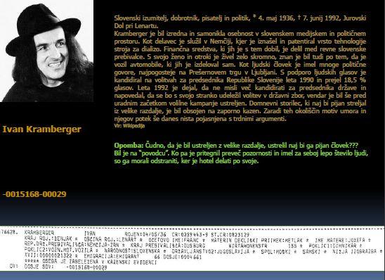 Zdaj pa k mojem videnju krute zgodbe na začetku nove države Slovenije, umorjenega gospoda Ivana Krambergerja, ki ga premetenci vedno znova obudijo k spominu, ko je treba preusmerjati pozornost od česa bistvenega. To ljudi zanima. Te dni so govorili, da domnevni morilec gospod Peter Rotar ne dovoli postavitve spomenika in ga bo miniral, če ga bodo postavili.