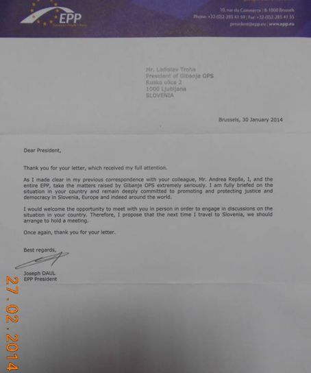 "Zahvaljujem se za vaše pismo, ki je bilo v polni deležno moje pozornosti. Jaz in celotna EPP jemljemo vaše zadeve ekstremno resno. Popolnoma sem seznanjen s situacijo v Sloveniji in ostajam globoko zavezan k spodbujanju in zaščiti pravice in demokracije v Sloveniji, Evropi in po svetu.