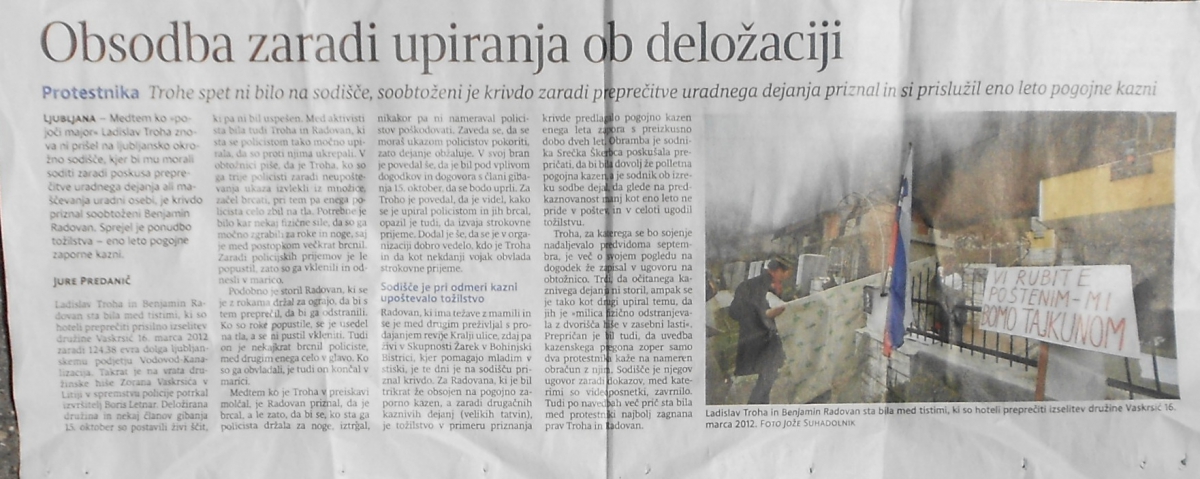 Novinar Jure Predanič je 18.07.2014 v članku z naslovom »Obsodba zaradi upiranja ob deložaciji« s podnaslovom: »Ladislav Troha spet ni prišel na sodišče, soobtoženi pa je krivdo priznal in si prislužil eno leto pogojne kazni« zapisal kot je v tem časopisu navada, nove in ponavljajoče se neresnice.
