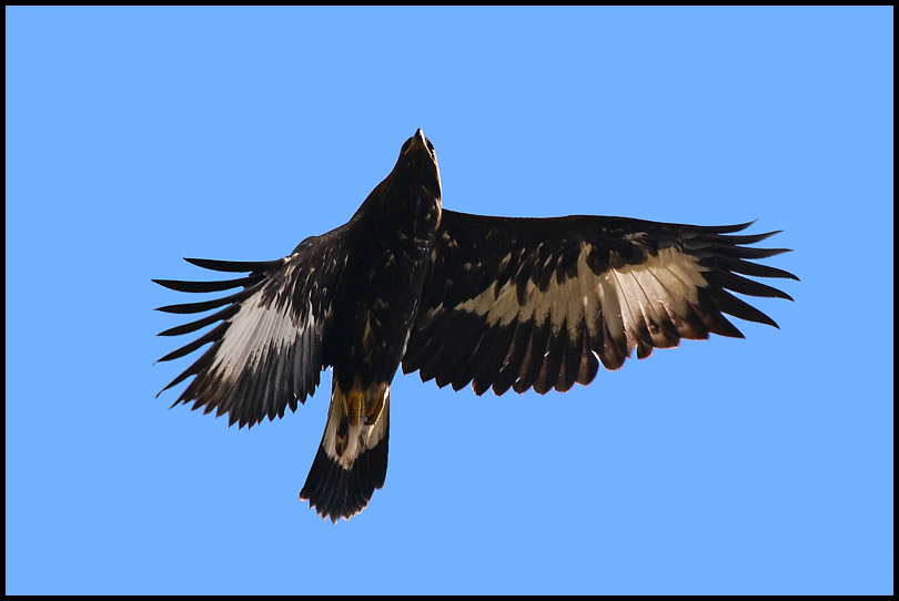 Nekega dne je zagledal prelepo ptico, ki je jadrala na nebu. Kokoši in petelini so se prestrašeno poskrili pod drevesa in grmičevje. On je storil enako, vendar ptice ni izpustil izpred oči. »Tako je lepa!« je vzkliknil mladi orlič. Mati koklja pa je rekla: »To je orel, najlepša in najmogočnejša ptica med vsemi na nebu.«