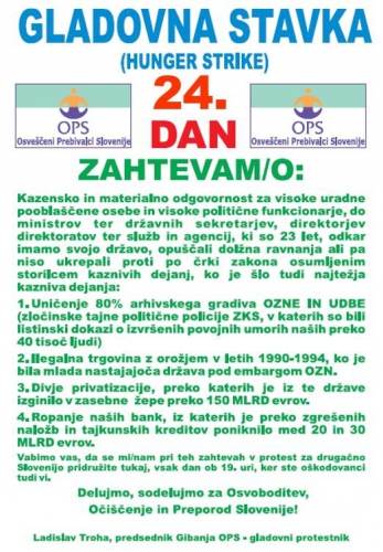 Dodajo še, da so gladovno stavkali do zdaj 3 ljudje, ki so jim menda pomagali, a je šlo za osebne bolj socialne zadeve. Tudi pri meni gre med drugim za osebno zadevo več letne tiranije udbomafije nad mano in nad družino. Zaradi političnih (jaz naj bi bil politični protestnik) ni stavkal še nihče. Češ, nima smisla. In varuhinja – udbopartijska manipulatorka je še dodala, da ni pravi način, ker se da tudi drugače…je morda povedala, kako, če mi je zavračala z oblastniškimi mišicami vse moje prijave??? In še vprašanje za vse položajnike, kdaj se boste opredelili do ZAHTEV, ki ste jih vsi dobili na svojo elektronsko pošto??? Ali bomo v tej državi postavili odgovornost do ljudi, ki smo jih plačevali in so na ključnih položajih opuščali dolžna ravnanja?!