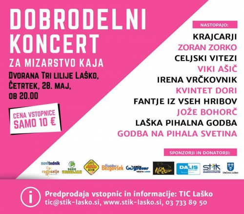 Koncert bo v dvorani Tri Lilije v Laškem ta četrtek dne 28.5.2015 ob 20.00.  Nastopili bodo: Krajcarji, Zoran Zorko, Celjski vitezi, Irena Vrčkovnik, Jože Bohorč, Ansambel Dori, Fantje iz vseh hribov, Boštjan Dirnberk, Laška pihalna godba, Vlado, Damjan Murko, Viki Ašič, Ansambel Utrip in Svetnska godba na pihala, tako da je 10€, kolikor stane karta, pravzaprav zelo malo. Vstopnico lahko kupite ali rezervirate na TIC Laško, 03 733 89 50 ali tic@stik-lasko.si.