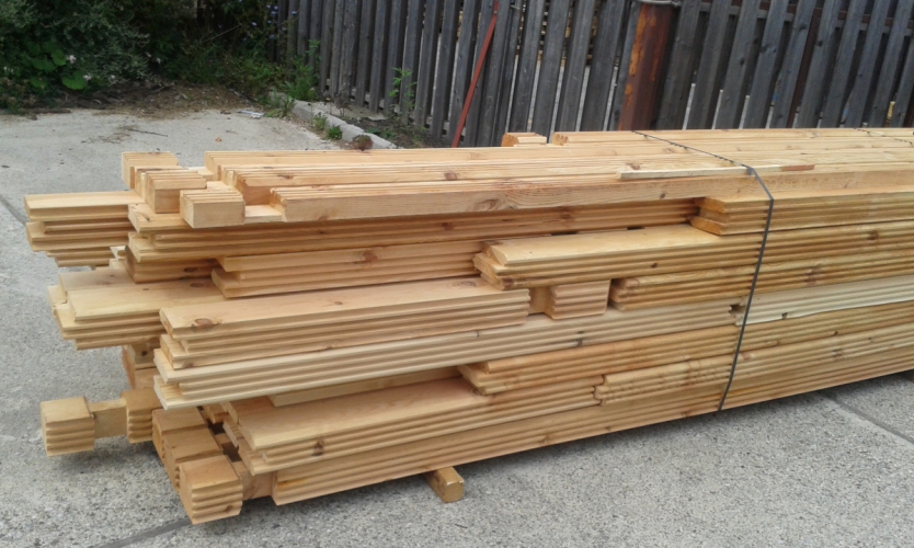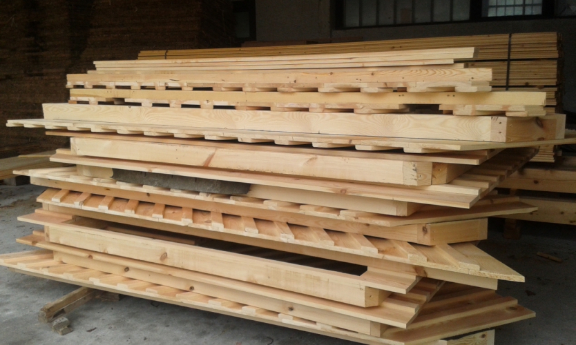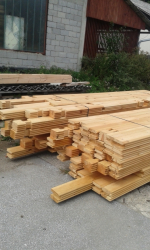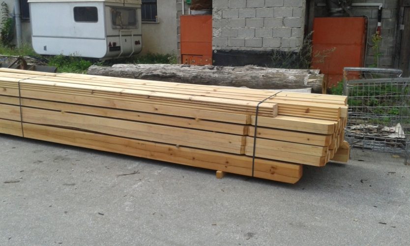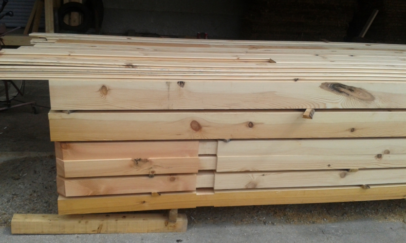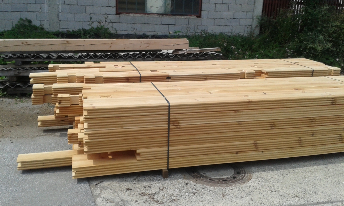 Na Zaplani pri Vrhniki nastaja nova lesena hiša. Osnovni material je borov les, ki je pripravljen za odpremo na lokacijo.