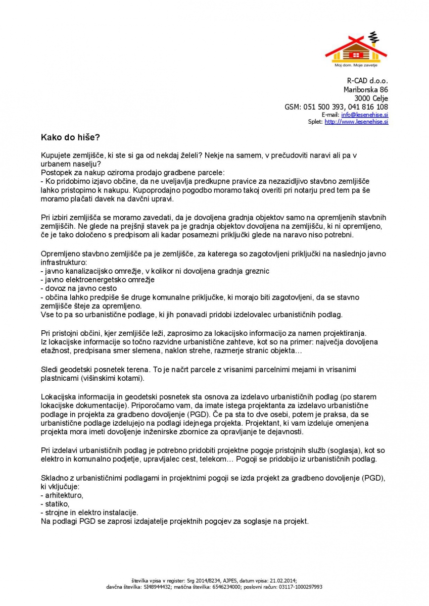 R-CAD d.o.o. Mariborska 86 3000 Celje Slovenija Poslovni prostori: Mariborska 86 3000 Celje email: info@lesenehise.si prodaja@lesenehise.si web: www.lesenehise.si 041 816 108, 041 348 682
