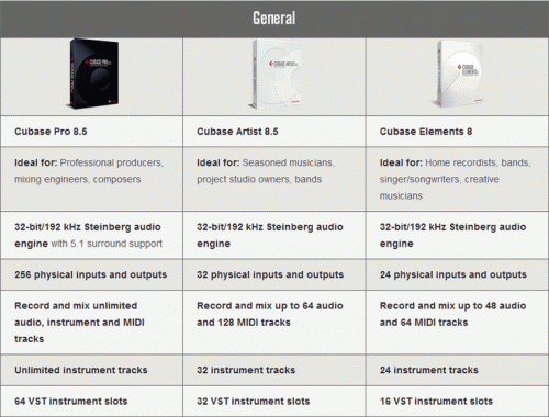 Primerjava DAW programov Cubase Pro 8.5 / Artist 8.5 / Elements 8