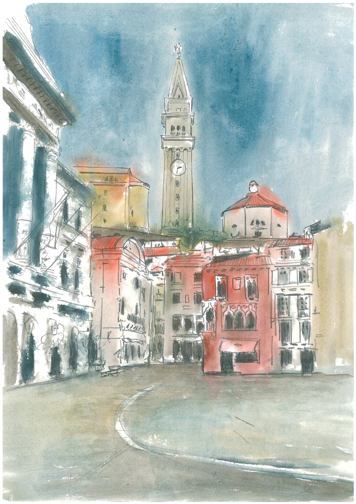 Piran - Pogled s Tartinijevega trga na zvonik cerkve Sv.Jurija Risba s svinčnikom / Akvarel Dimenzija: 29 x 40 cm