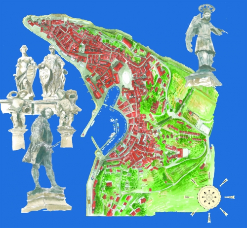 Nekaj akvarelov z motivi Piranske sakralne arhitekture in plan Pirana, pa so našli svoje mesto v knjižici "Piranski angel - L'angelo di Pirano", avstrijskega avtorja Folkea Tegetthoffa. Zgodba o Piranskem angelu, ki domuje na vrhu zvonika Sv.Jurija, je v slovenščini in italjanščini na voljo obiskovalcem zvonika Sv.Jurija. Moj prispevek so bile ilustracije in oblikovanje knjižice. Reprodukcija mape Pirana pa je našla svoje mesto tudi na pultu v vhodu zvonika Sv. Jurija.