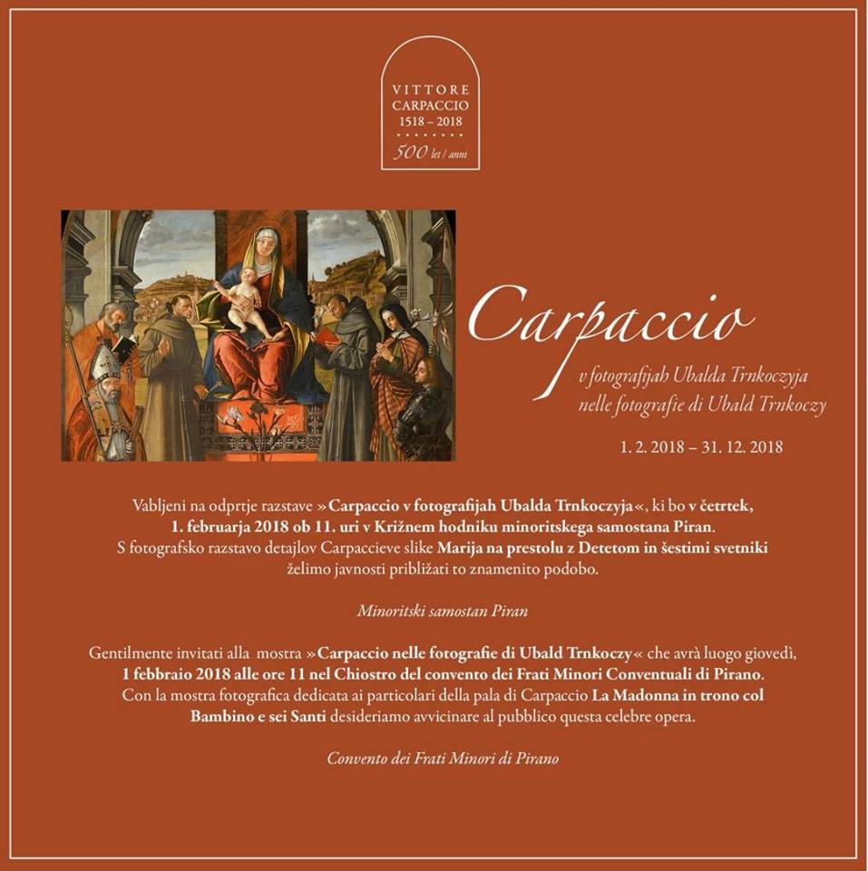 Priznati pa moram, da to ni bila edina literatura, ki smo jo uporabili kot podlago za strokovno izobraževanje članov naše ekipe. Namig pa smo dobili tudi iz minoritskega samostana Sv.Frančiška iz Pirana, kjer so v tem trenurtku maksimalno angažirani na projektu Carpaccievo leto v Piranu. V Križnem hodniku minoritskega samostana Piran. je namreč postavljena razstava »Carpaccio v fotografijah Ubalda Trnkoczyja«. S fotografsko razstavo detajlov Carpaccieve slike Marija na prestolu z Detetom in šestimi svetniki želijo javnosti približati to znamenito podobo. Razstava bo na ogled do 31. decembra 2018.