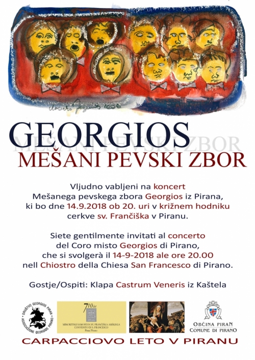 Vljudno vabljeni na koncert Mešanega pevskega zbora Georgios iz Pirana, ki bo dne 14.9.2018 ob 20. uri v križnem hodniku cerkve sv. Frančiška v Piranu.