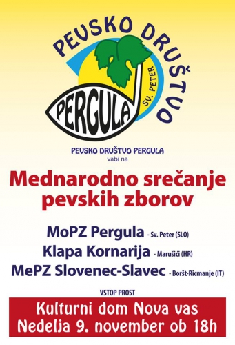 Moški pevski zbor PERGULA vas vabi na mednarodno srečanje pevskih zborov, ki bo v nedeljo 9.novembra ob 18.00 uri v Kulturnem domu Nova vas.