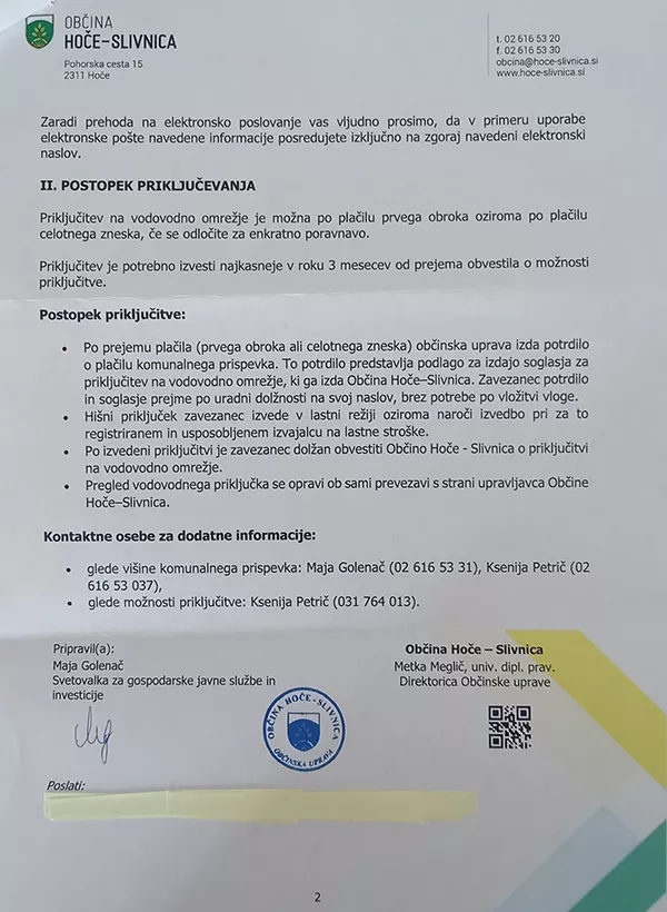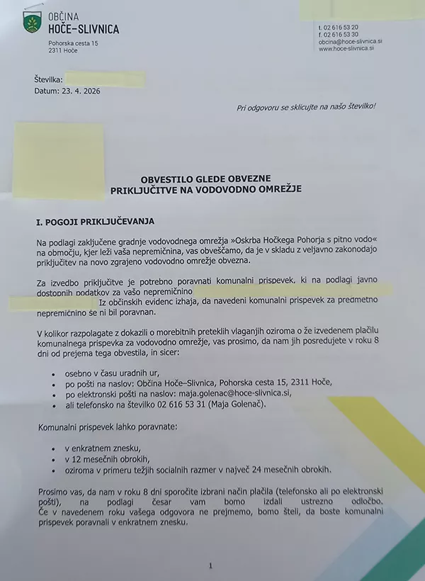 Prebivalci Hočkega Pohorja so prejeli priporočena obvestila pošiljatelja Občine Hoče-Slivnica glede obvezne priključitve na vodovodno omrežje. Občina je namreč zaključila gradnjo vodovodnega omrežja "Oskrba Hočkega Pohorja s pitno vodo" in danes, v torek, 28. 4. 2026, prenekateremu Pohorcu z obvestilom dvignila tlak in povzročila slabo voljo. V obvestilu je navedeno, citiram, "da je v skladu z veljavno zakonodajo priključitev na novo zgrajeno vodovodno omrežje obvezna." Obvezna?